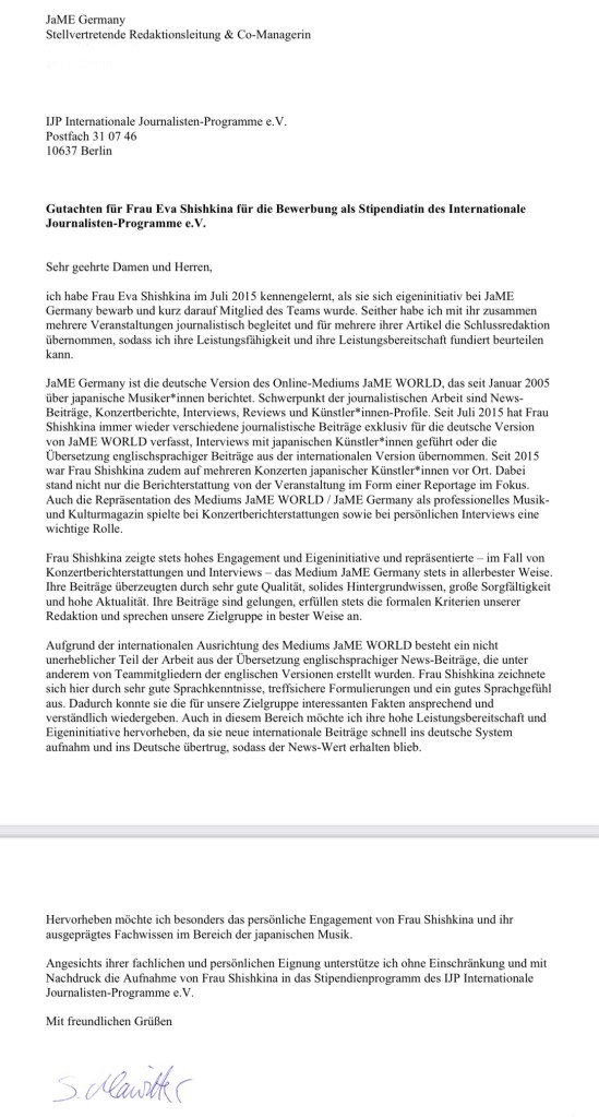 По второму образованию я журналиcт. И конечно пишу на немецком. Моя журналистская практика включает в себя в том числе работу в первом немецкоязычном журнале о современной японской музыке. Десятки обзоров, рецензий, интервью с артистами… Вот что пишет наш главред: «Фрау Шишкина отличается отличным владением немецким языком, точными формулировками и хорошим языковым чутьем. Таким образом она доходчиво и ясно доносит интересные факты до нашей целевой аудитории. Я хочу подчеркнуть ее компетентность и инициативность, которые выражаются также и в оперативности, с которой она переводит международные материалы на немецкий язык…»