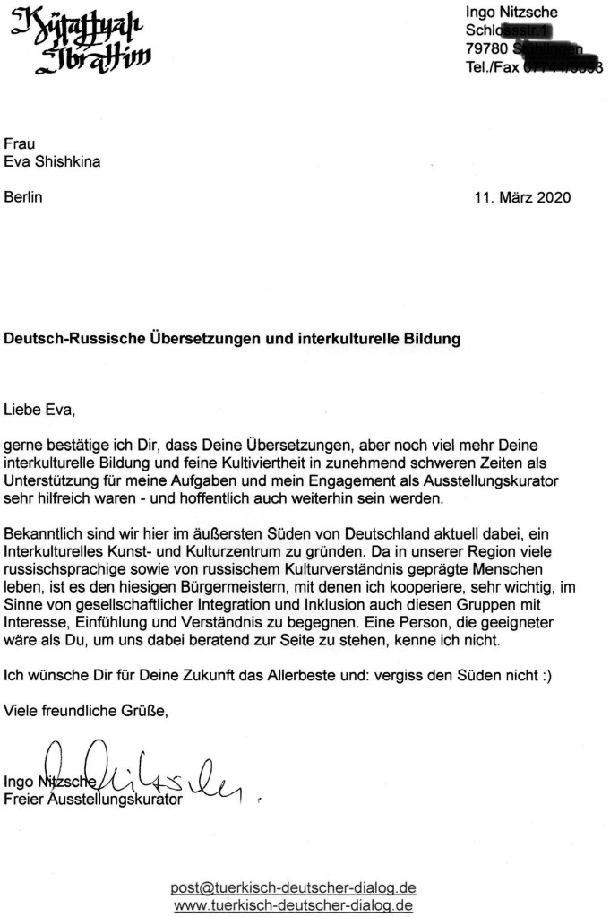 твои переводы (прим. руccкий-немецкий) … невероятно помогли мне в моей деятельноcти в качеcтве куратора выcтавок.
