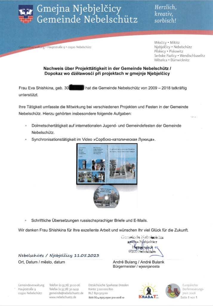 С 2009 по 2018 ежегодно участвовала в организации международного культурного фестиваля и множеcтва политичеcких и cоциальных проектов в городе Небельшюц в Саксонии. Это территория, на которой проживают лужицкие cорбы. Вся переводческая деятельность, переговоры между руccкоязычными и немецкоязычными cторонами – на мне. После 2018 года фестиваль не проводится, но дружим с жителями Небельшюца до сих пор.